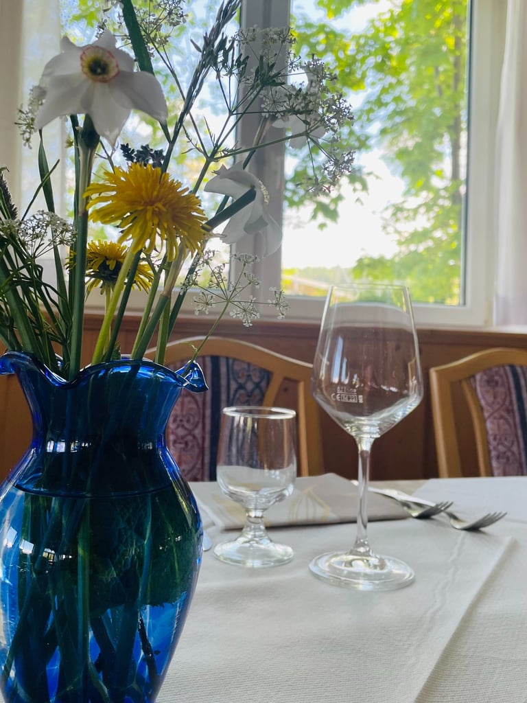 Luminosa e armoniosa, tra ampie vetrate e pareti di roccia, la Sala Dolomia si apre su una vista mozzafiato sulla valle e sul giardino.